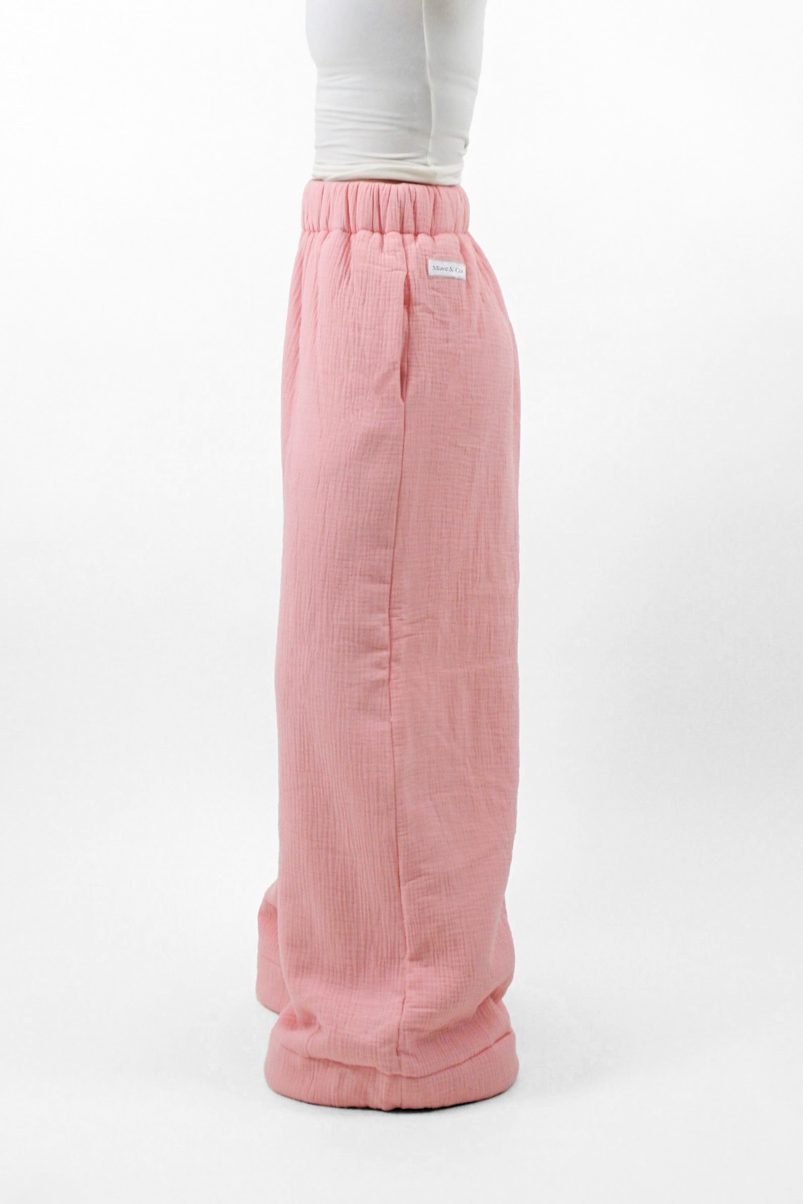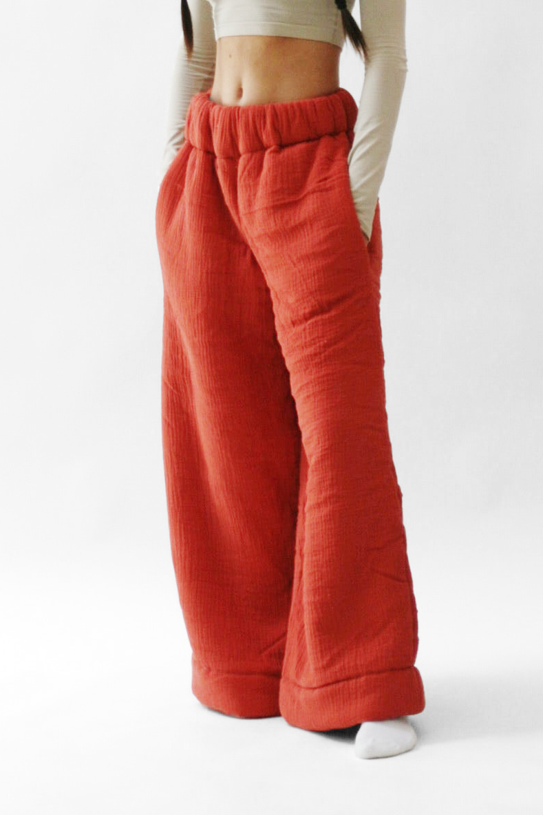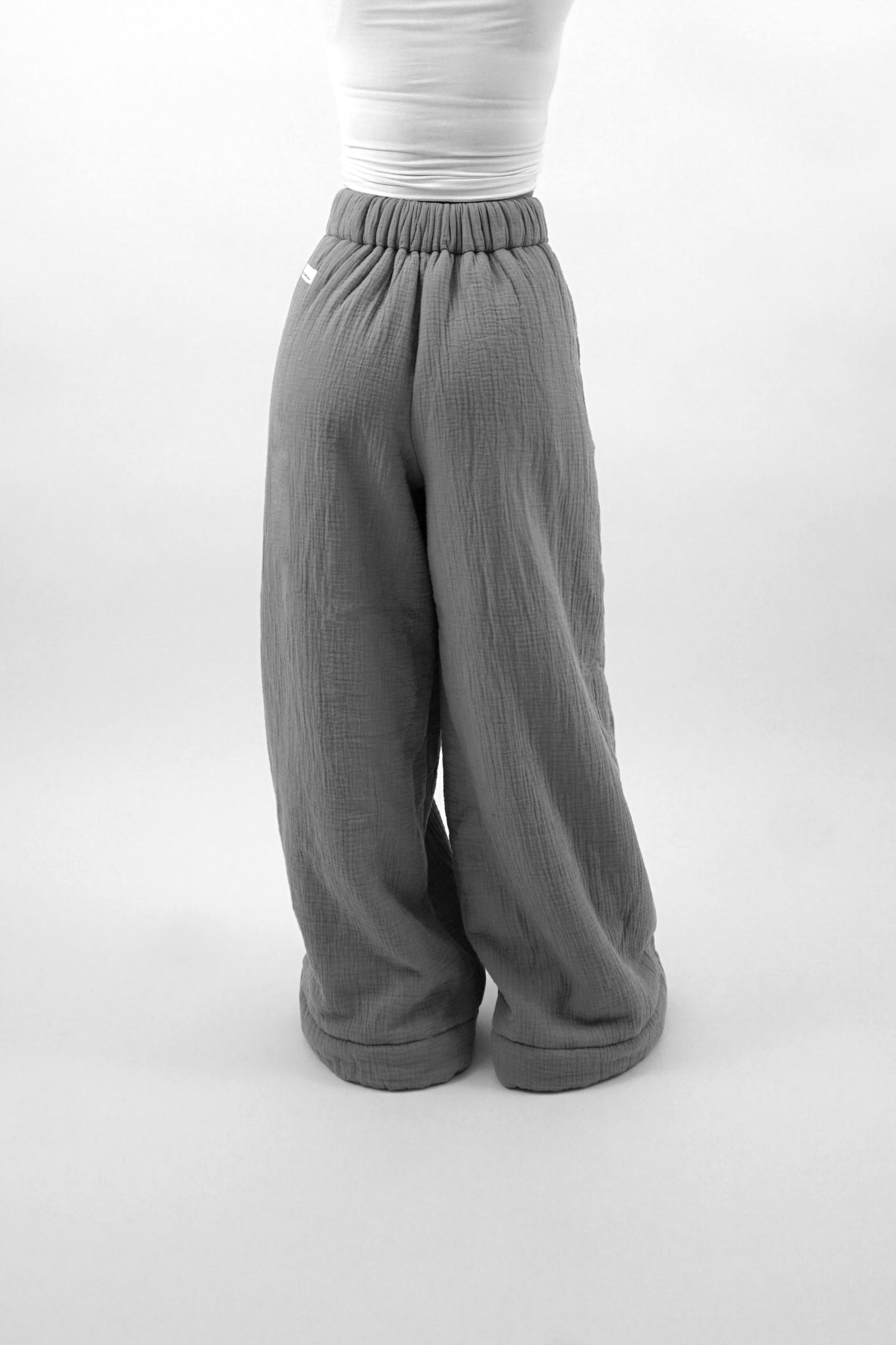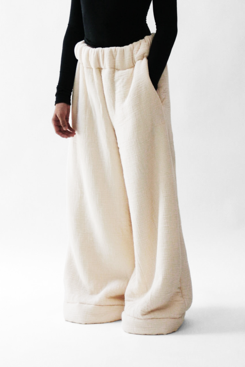 Think of them as the lovechild between your favorite blanket and the comfiest pants you've ever worn. They're sherpa-lined pants with a bubble gauze exterior that give you that "wrapped in a blanket" feeling while you're actually up and moving around. It's a completely new category - not quite loungewear, not quite a blanket - but the best parts of both.
