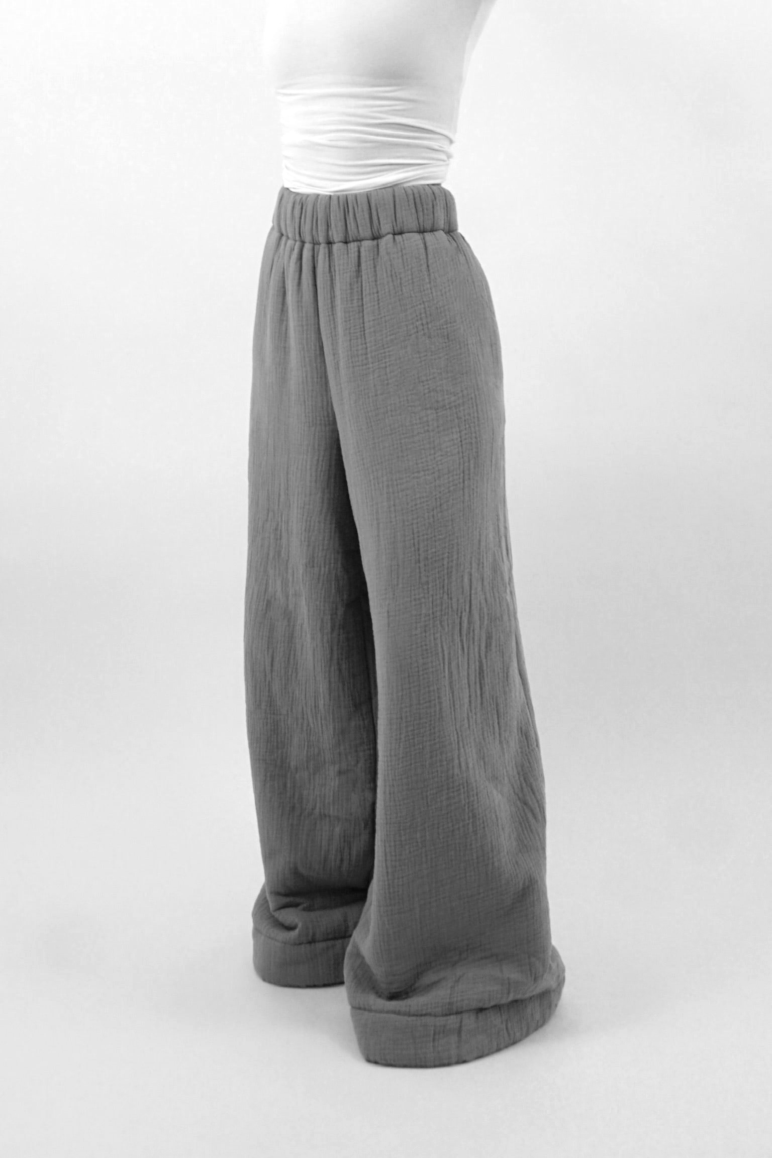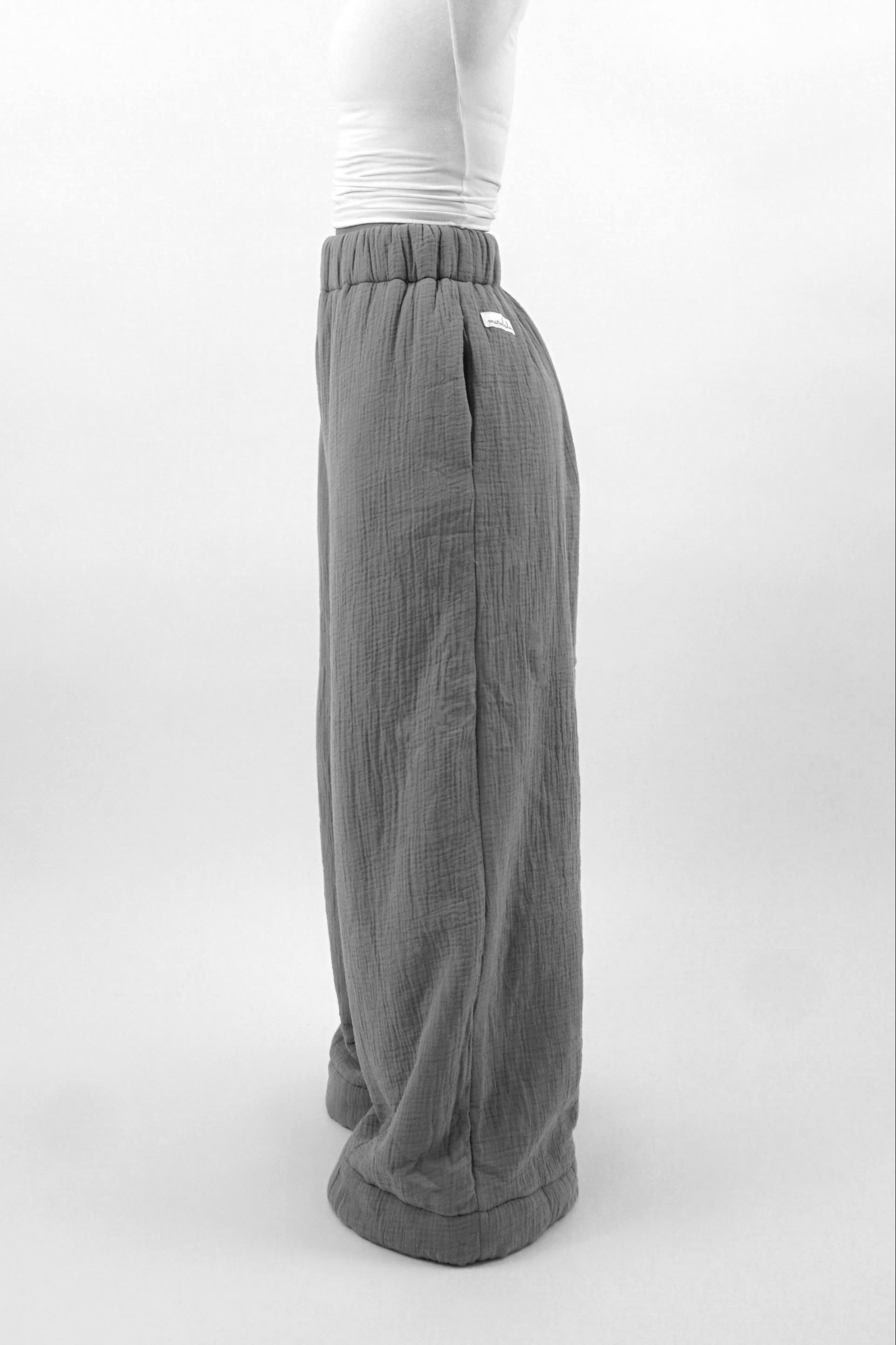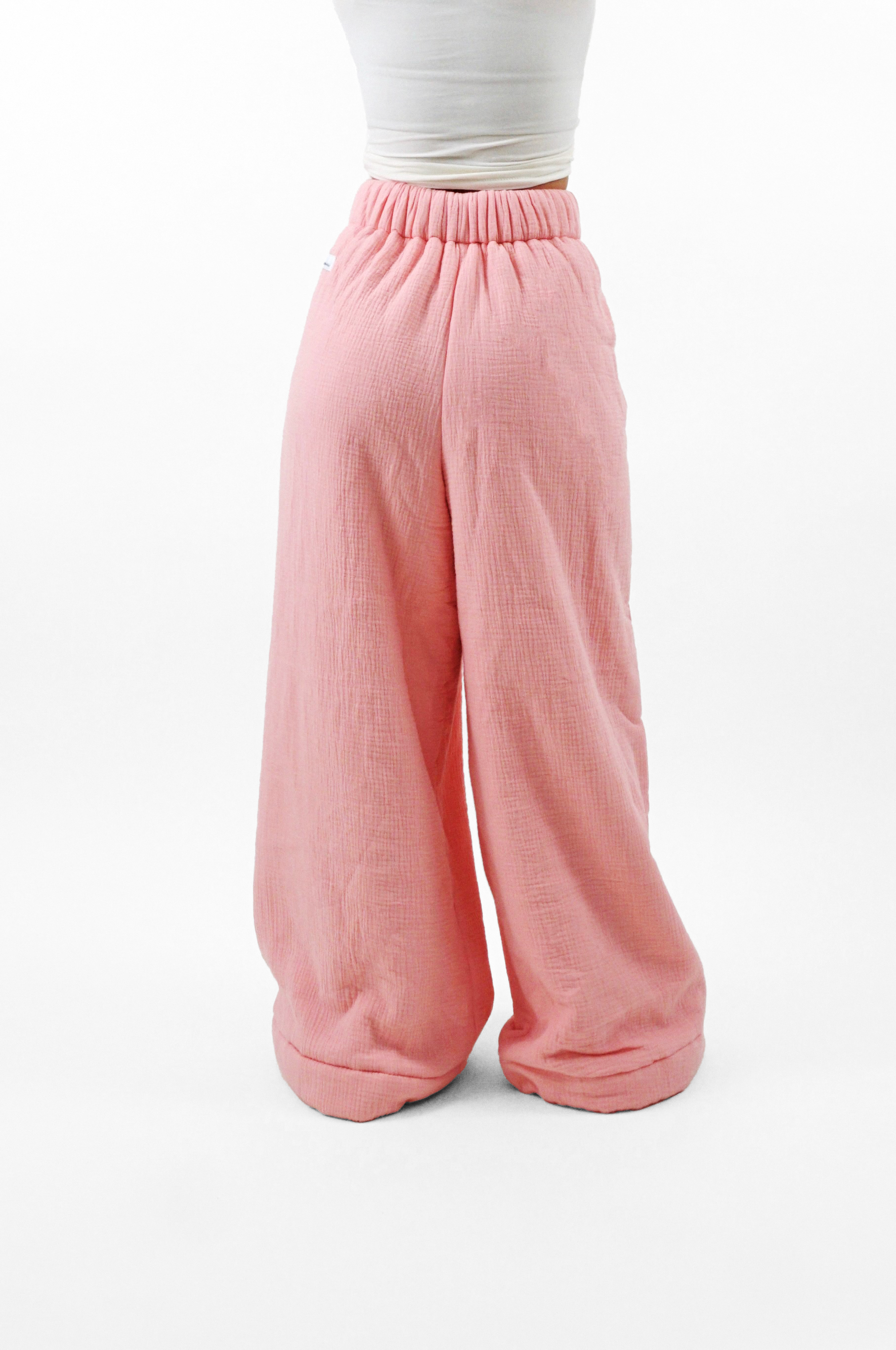 Think of them as the lovechild between your favorite blanket and the comfiest pants you've ever worn. They're sherpa-lined pants with a bubble gauze exterior that give you that "wrapped in a blanket" feeling while you're actually up and moving around. It's a completely new category - not quite loungewear, not quite a blanket - but the best parts of both.