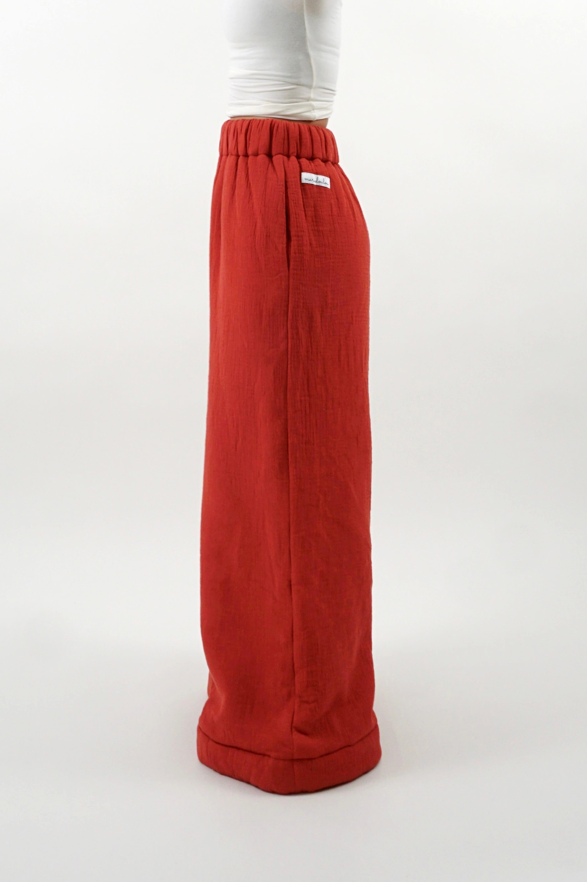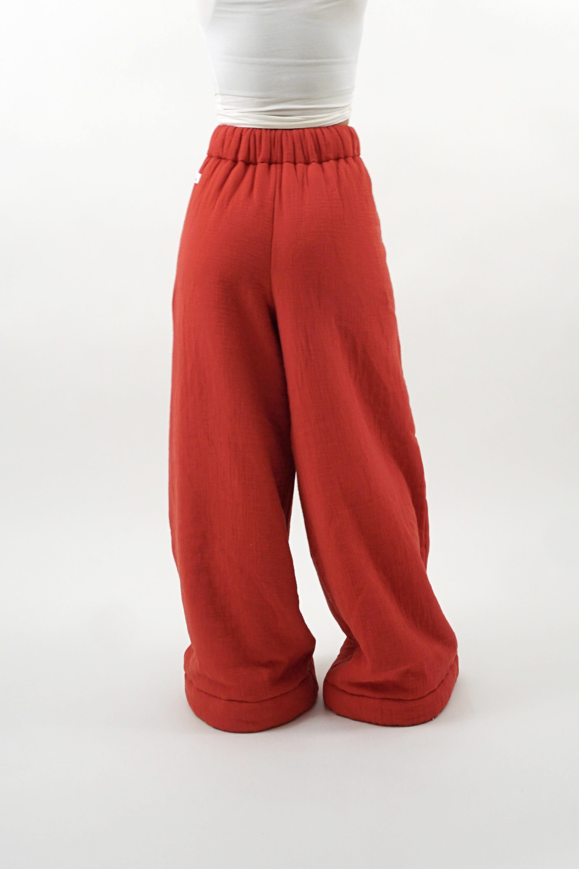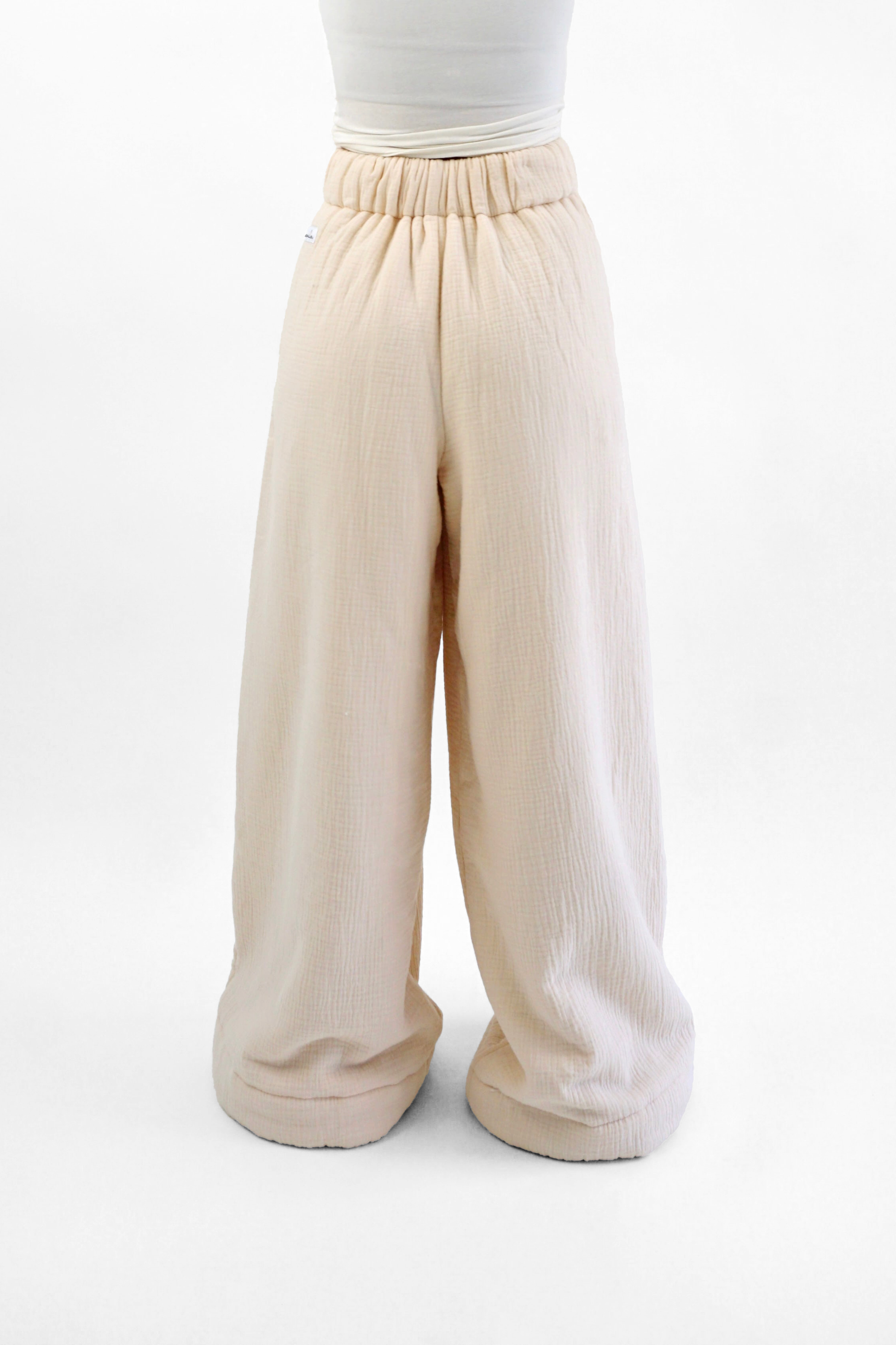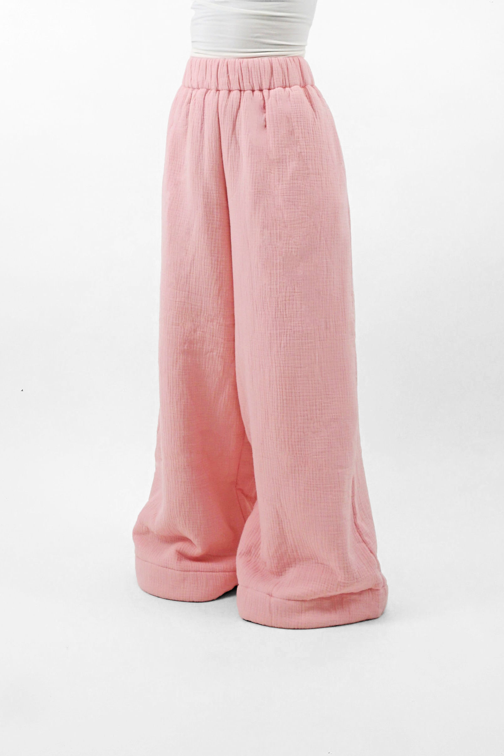 Think of them as the lovechild between your favorite blanket and the comfiest pants you've ever worn. They're sherpa-lined pants with a bubble gauze exterior that give you that "wrapped in a blanket" feeling while you're actually up and moving around. It's a completely new category - not quite loungewear, not quite a blanket - but the best parts of both.